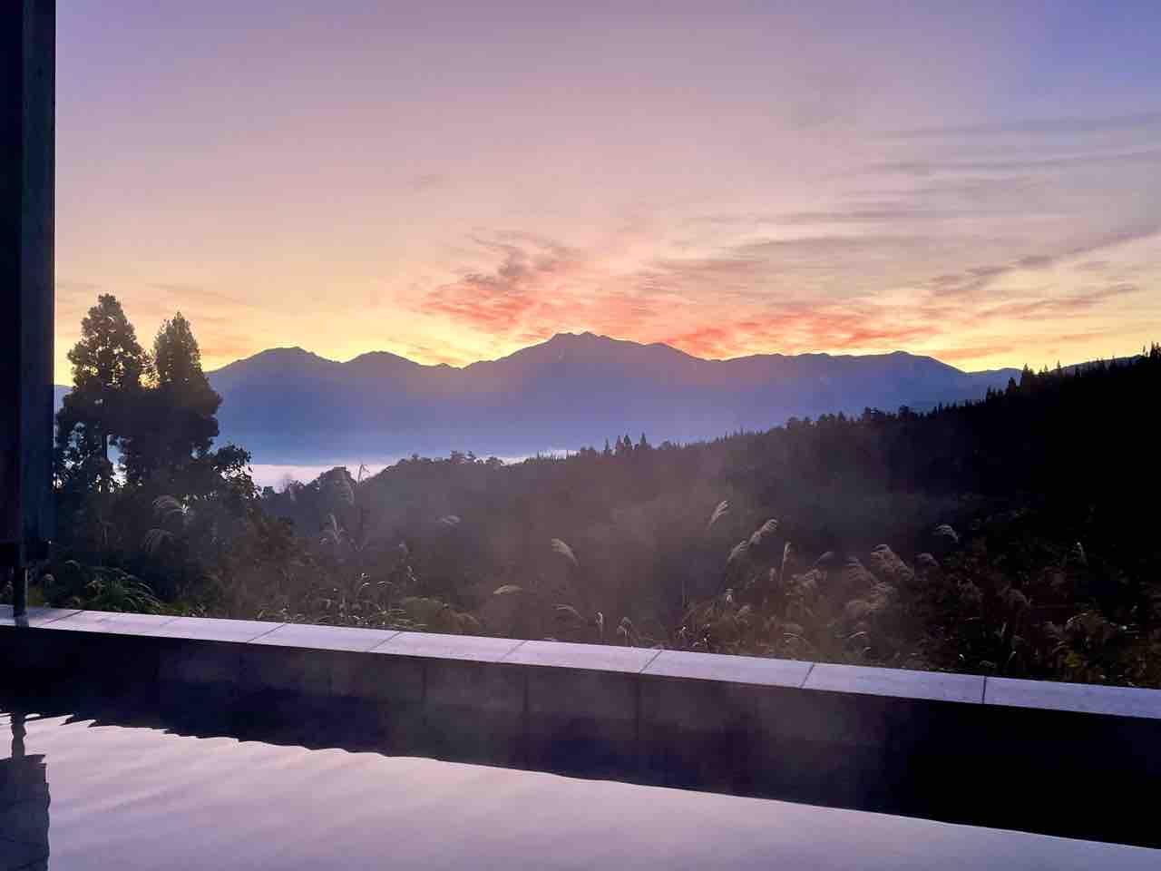 部屋から外を眺める素晴らしく晴れている。山も美しい。すぐに露天風呂へ。